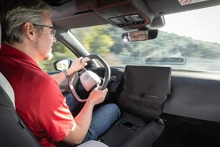 Das Cockpit dürfen wir (noch) nicht zeigen, aber das Zweispeichenlenkrad mit echten Tasten sehr wohl.