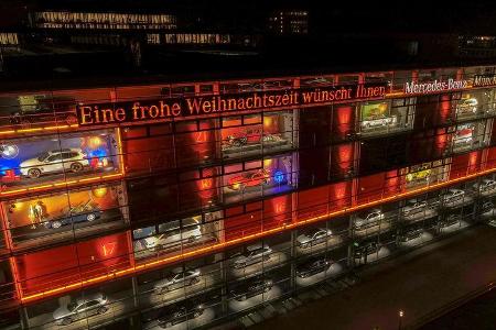 Der Schaufensterkalender von Mercedes existiert bereits seit 2002 und zeigt an jedem Tag vom 1. bis zum 24. Dezember ein Mercedes-Modell. In diesem Jahr kooperieren die Stuttgarter mit der Münchener Initiative "kauf lokal" und bieten 24 Unternehmen Platz im gläsernden Adventskalender.