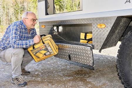In den Schürzenfächern aus Alublech ist Platz für unempfindliches Zubehör.