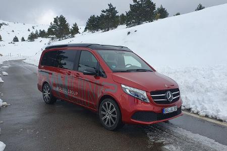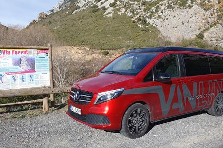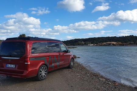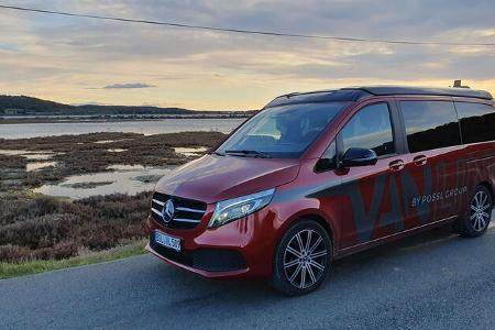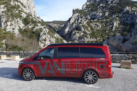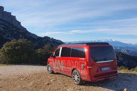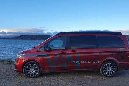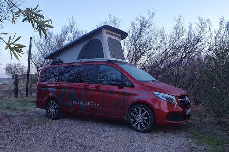 Der Pössl Campstar Camillo ist eine vollausgestattete V-Klasse mit kräftigem Motor, Vierradantrieb, Anhängerkupplung, einem Aufstelldach und einer kleinen Küchenzeile.