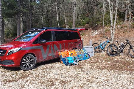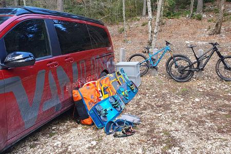 In diesem Fall: Zwei Kite-Ausrüstungen mit sechs Schirmen und zwei Kiteboards, zwei Enduro-Mountainbikes und Kletterausrüstung.