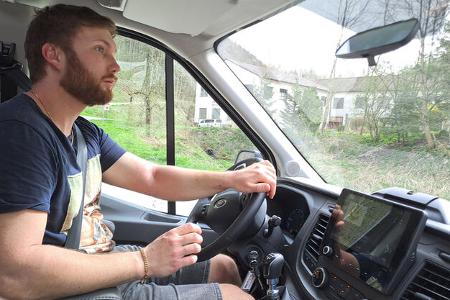 Das Fahrgefühl im hochgelegten Ford Transit ist anfangs gewöhnungsbedürftig. Hat man sich erst mal an die Aussicht und das gut gefederte Fahrzeug gewöhnt, fährt es sich gar nicht mal so übel.