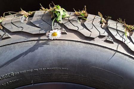 Das grobe Profil der Offroad-Reifen pflügt schnell mal den halben Campingplatz um. Dieses tapfere Gänseblümchen zeigt Überlebenswillen.