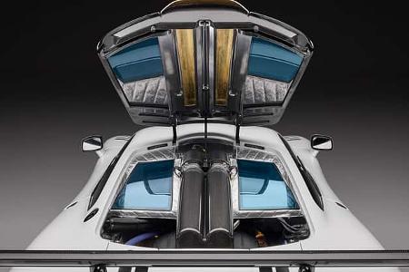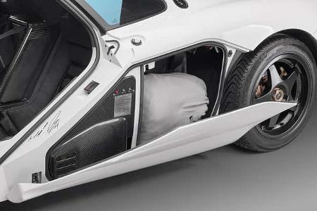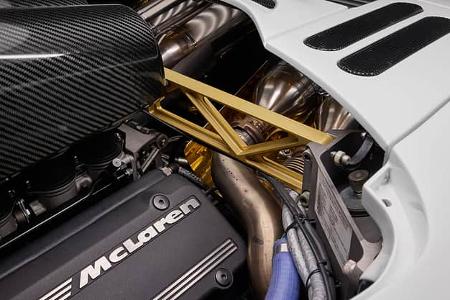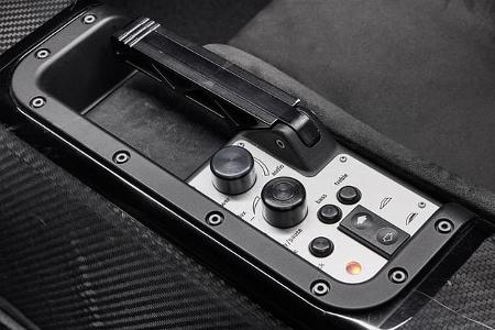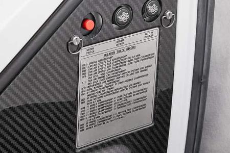 Hinter der Klappe an der Seite wird das Carbonchassis sichtbar. Eine Plakette weist auf die Motorsporterfolge von McLaren hin und ein Fach nimmt Gepäck auf.