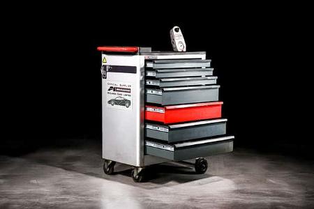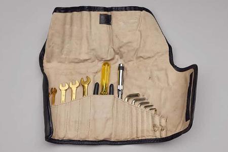 Exklusive Werkzeugtasche mit goldenen Schraubenschlüsseln.