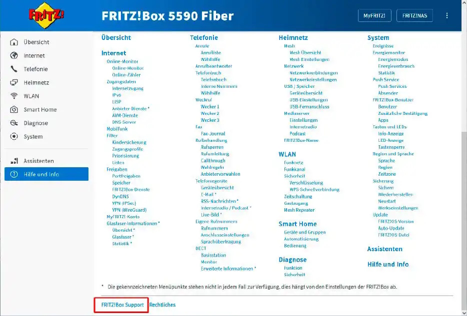 - Links klickst Du nun auf „Hilfe und Info“, dann geht es weiter nach unten zu „FRITZ!Box Support“.