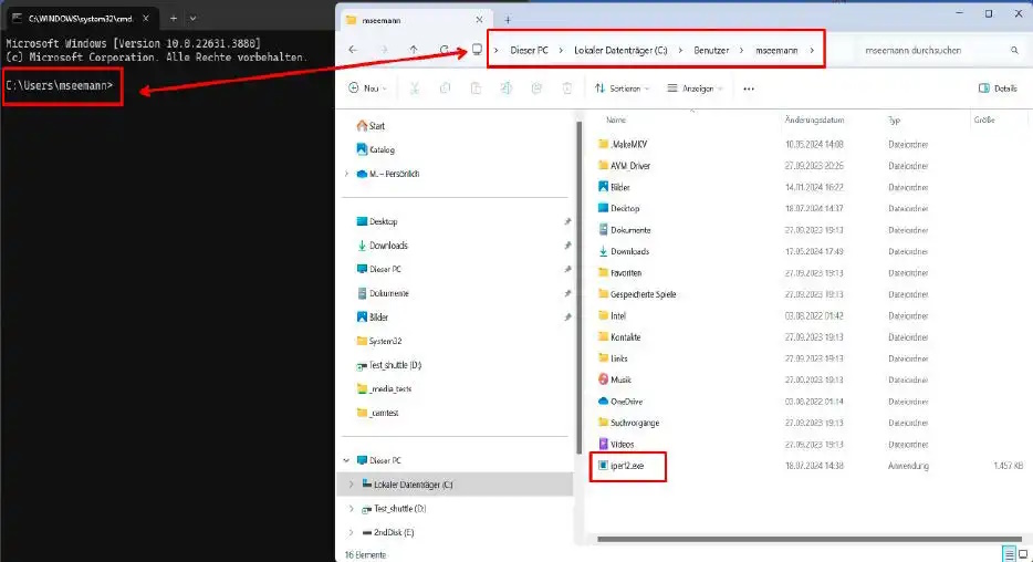 iPerf2 ist ein Kommandozeilentool, Du hast also kein grafisches Interface, das Du via Maus bedienen kannst. Stattdessen musst Du alles eintippen, was vielleicht ungewöhnlich ist, wenn Du noch nie mit Tools dieser Art gearbeitet hast. Die heruntergeladene Datei solltest Du zuerst aus dem Downloads-Ordner in den Nutzernamenordner verschieben. Den findest Du immer unter C:\Benutzer\deinNutzerName, wobei „deinNutzerName“ der Name ist, mit dem Du Dich bei Windows anmeldest (oder sehr ähnlich). Dorthin verschiebst Du die heruntergeladene iPerf2-exe. Außerdem änderst Du ihren Namen am besten in etwas Kurzes, wie „ip2.exe“. Je kürzer, desto leichter wirst Du es später haben.
