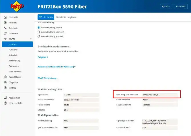 Ein Beispiel könnte die glasfäherfähige FRITZ!Box 5590 Fiber sein. Sie beherrscht Wi-Fi 6, funkt daher gerne über 5 GHz und macht dies mit einer Bandbreite von 160 MHz. Vier parallele Datenströme kann das Gerät bündeln, um die Datenrate zu erhöhen.