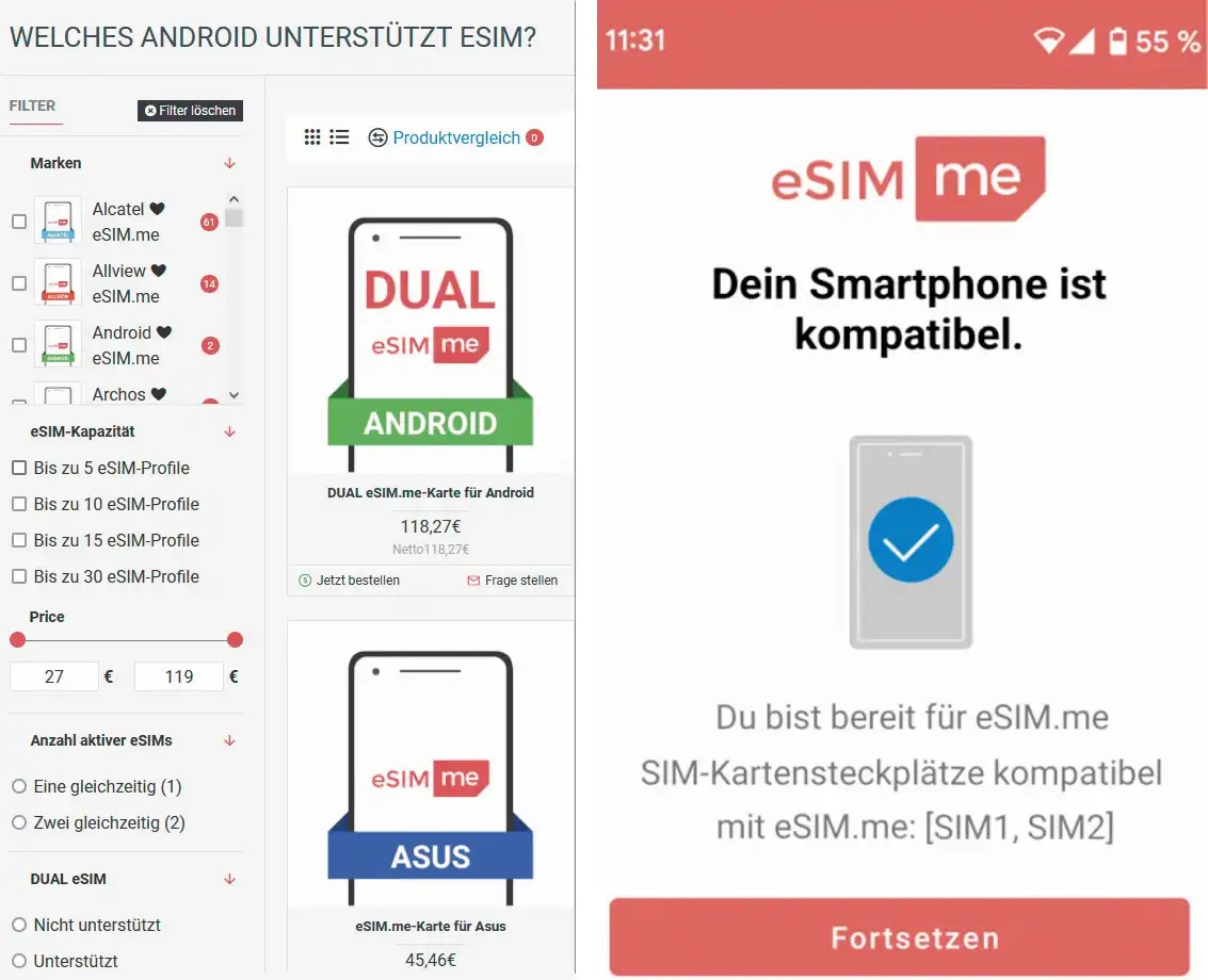 Damit bekommst Du eine Möglichkeit, die diversen Vorteile von eSIMs auch auf Handys zu verwenden, die dies eigentlich nicht können. Auf der Webseite von Telcovillage kannst Du zu diesem Zweck Karten für unterschiedliche Geräte kaufen. Auch hier gilt, dass weitverbreitete Smartphones die besten Chancen haben, kompatible Karten zu bekommen.