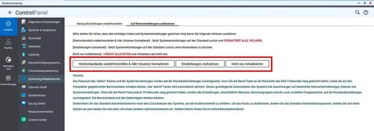 Wie ein Software-Reset bei Deinem NAS genau funktioniert, steht im Handbuch Deines Systems. In der Regel ist dies möglich, wenn Du vollen Zugriff als Admin hast. Bei den meisten Systemen funktioniert ein solcher Software-Reset ähnlich. Bei den Geräten des Herstellers Qnap findest Du den Punkt zum Beispiel so: