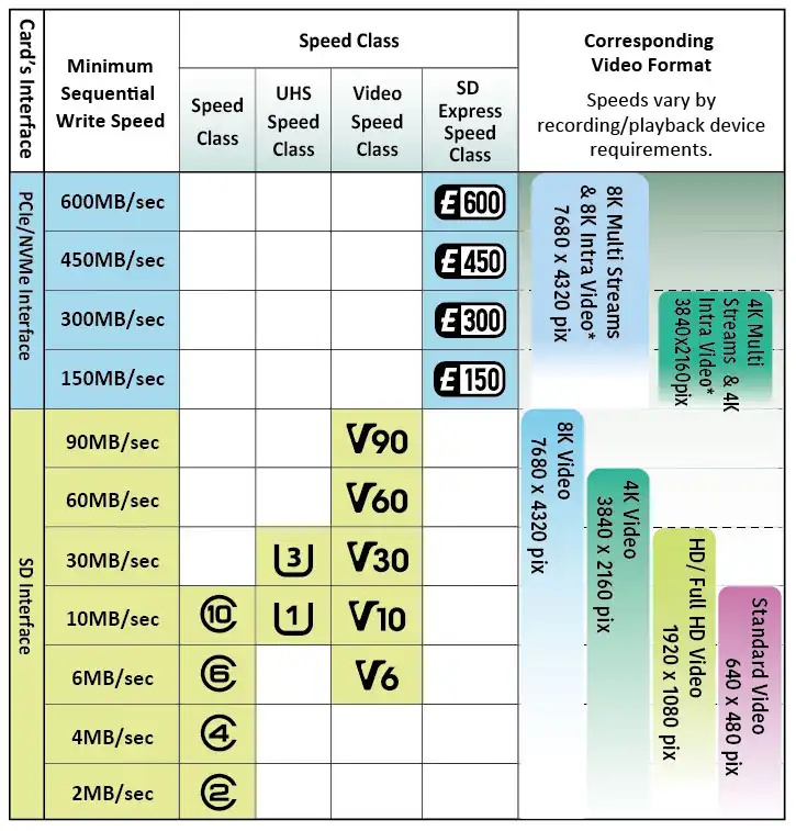 SD-Express-Geschwindigkeitsklasse: Damit kommen wir zum neuesten Standard für SD-Karten. Dieser entwickelt die gerade erwähnte Video Speed Class weiter und erhöht die Bandbreite und Geschwindigkeit mit Multi-Streams.