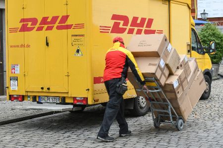 Symbolbild: Ein DHL-Mitarbeiter bei der Paketzustellung.