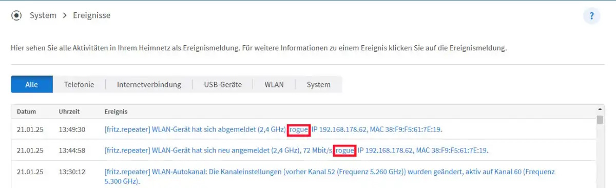 Um die Sachlage noch genauer zu prüfen, schaust Du nun ins Ereignisprotokoll des Routers. Dazu gehst Du auf „System“ und dann „Ereignisse“. Dort kannst Du einsehen, wann sich das Gerät in Deinem Netzwerk angemeldet (oder abgemeldet) hat. Aus diesen Informationen könntest Du vielleicht ableiten, ob es sich um eines deiner Geräte oder ein Fremdgerät handelt.