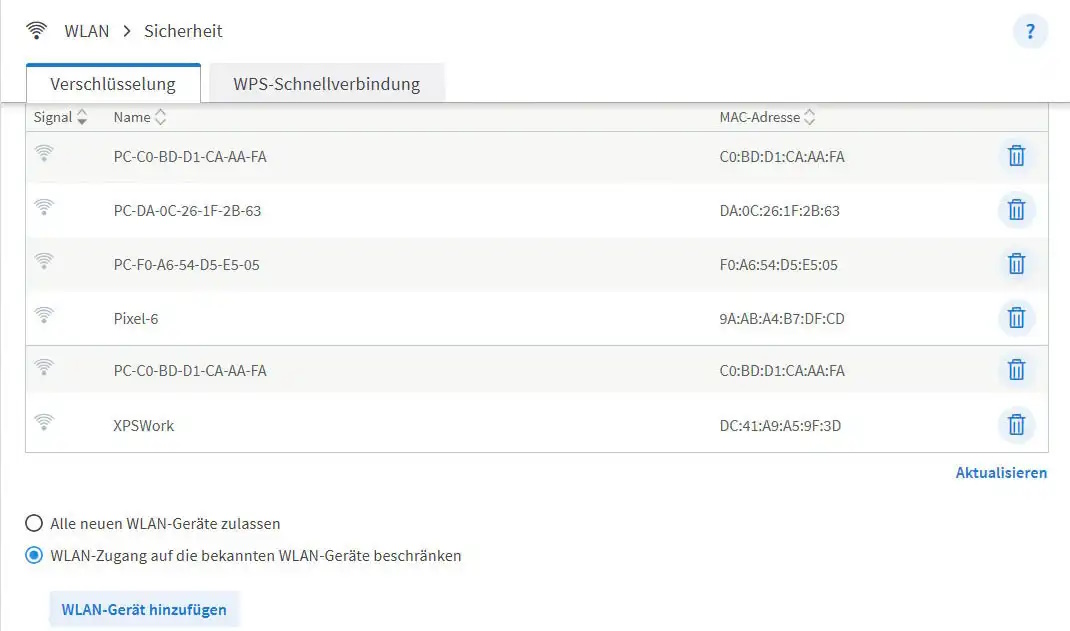 Ebenfalls denkbar ist die Einrichtung eines MAC-Filters unter „WLAN“, „Sicherheit“ und „Verschlüsselung“. Dort kannst Du den „WLAN-Zugang beschränken“ und schließlich den „WLAN-Zugang auf die bekannten WLAN-Geräte beschränken“. So stellst Du sicher, dass garantiert keine anderen Geräte von außen eindringen können (es sei denn, die Angreifer fälschen ihre MAC-Adressen).