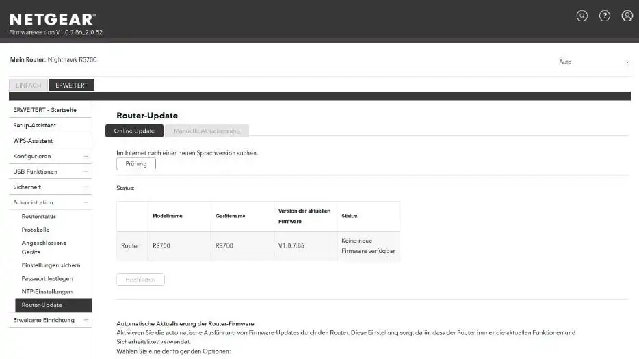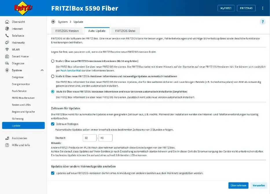 Du kannst auch festlegen, wann der Router das Update einspielen soll. Diese Option findest Du unter „Zeitraum für Updates“. Du gibst eine Startzeit ein und die Fritzbox installiert das Update dann irgendwann in den auf die Startzeit folgenden drei Stunden. Solltest Du hier nichts einstellen, erfolgt das Update entweder in der Nacht oder am frühen Morgen. Eine solche oder ähnliche Update-Funktion findest Du heute bei den meisten Routern. Bei Netgear zum Beispiel ist das automatische Update unter „Erweitert“, „Administration“ und dann „Router-Update“ aufgeführt. Bei Asus wiederum ist die Funktion in den erweiterten Einstellungen untergebracht unter „Administration“ und dann „Firmware-Aktualisierung“.