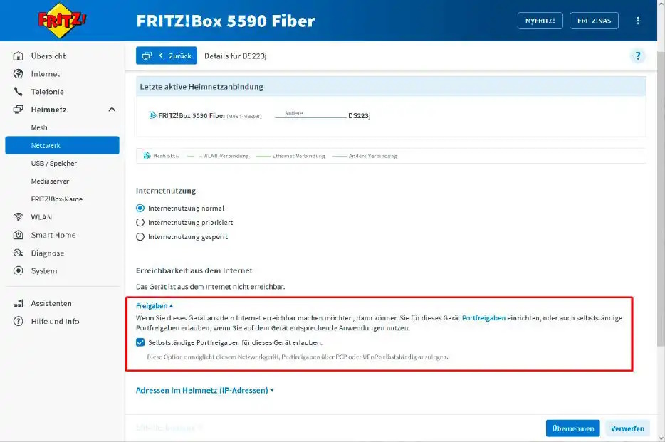 Eine explizite Freigabe für UPnP ist zum Beispiel bei vertrauenswürdigen Geräten wie IP-Kameras oder einem NAS sinnvoll. Wenn diese Ports selbstständig freischalten können, resultiert daraus eine bessere Verbindungsleistung zwischen WAN und LAN. Ansonsten solltest Du bei allen anderen Geräten UPnP deaktivieren. Wenn Du die Liste mit den Geräten und ihren jeweiligen Freischaltungen einsehen möchtest, begibst Du dich bei der Fritzbox über „Internet“ und „Freigaben“ zu den „Portfreigaben“.