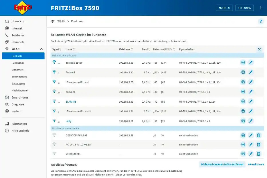 Wenn Du eine FRITZ!Box als WLAN-Router verwendest, kannst Du im Menü zunächst die Spalte „Eigenschaften“ anklicken und dort auf den Button „WLAN – Funknetz“ gehen, um die Kompatibilität Deiner Clients zu checken. Sind unter den Eigenschaften die Begriffe 11k sowie 11v aufgeführt, können die jeweiligen Clients die Informationen des Mesh-Systems hinsichtlich der Verbindungsempfehlungen verarbeiten.