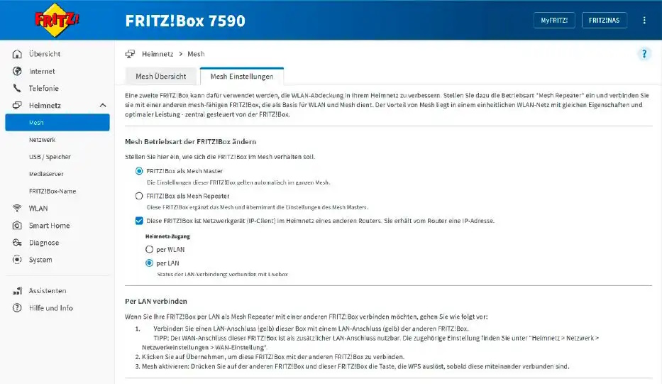 Mit einem passenden Router, der als Mesh-Master fungiert, kannst Du bedarfsorientiert WLAN, Powerline und Ethernet als Rückkanal verwenden. AVM überzeugt im Vergleich zu TP-Link mit mehr Setup-Optionen und Funktionen, so ist z. B. die Vernetzung mehrerer FRITZ!Boxen möglich. Die FRITZ!Box, die als Mesh-Master fungiert, kann dabei hinter einen anderen Router geschaltet werden und die Funktion eines IP-Clients übernehmen, also im Bridge-Modus laufen.
