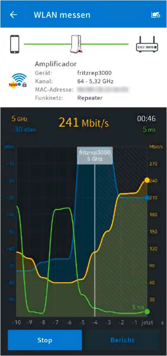 Du kannst außerdem in Echtzeit verfolgen, welche Auswirkungen eine andere Positionierung eines Clients auf die WLAN-Verbindung hat und somit durch Veränderung der Platzierung eine Optimierung herbeiführen.