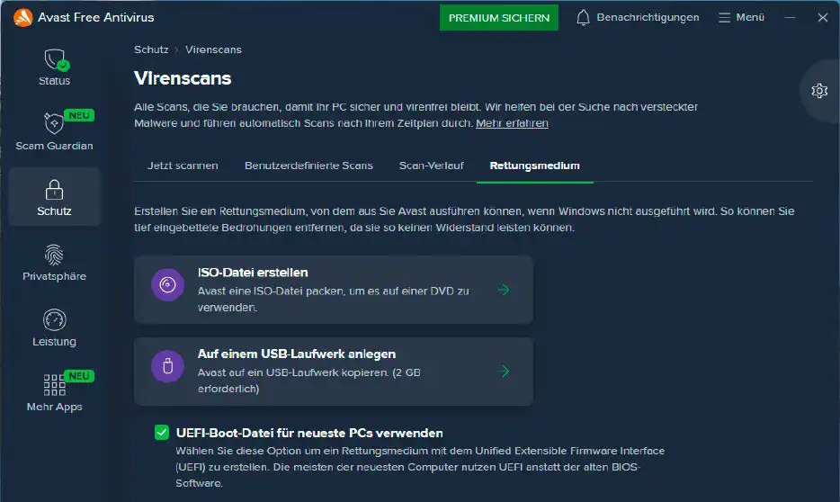 Bei einigen Virenschutzprogrammen lässt sich eine solche portable Variante des Programms direkt im Assistenten auf dem Speichermedium installieren. Bei den Herstellern Avast und AVG verfügt der portable Virenscanner über die gleichen Funktionen wie die installierte Variante. Zudem sind diese Scanner kostenlos. Norton Antivirus bietet ebenfalls eine portable Installation, ist allerdings kostenpflichtig. Das Antivirenprogramm muss für die Installation auf das Bootmedium bereits installiert sein. Hersteller wie Avira oder Kaspersky liefern dagegen Rescue Disks, welche Du lediglich herunterladen musst. Hierbei handelt es sich zumeist um Linux-Livesysteme mit einem zusätzlichen Virenscanner.