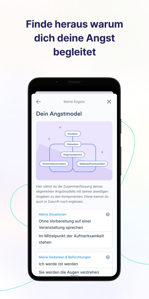 Durch die aus der kognitiven Verhaltenstherapie stammenden Übungen fördert die App die Auseinandersetzung Betroffener mit ihren Ängsten. Eigene Erfahrungen können über eine Tagebuch-Funktion protokolliert werden. Zudem sind „Angst-Experimente“ und Lernmodule in der App zu finden.