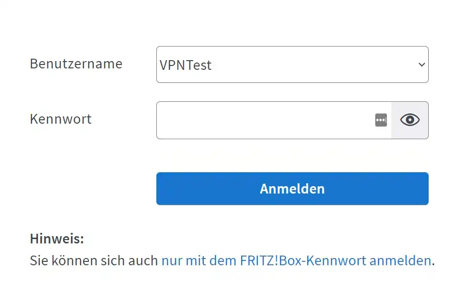 Das ist Dir zu aufwendig? Klicke dann einfach auf „Nur mit dem FRITZ! Box-Kennwort anmelden“. Diesen Hinweis findest Du unter dem Anmeldefenster in einem separaten Satz. In Zukunft muss dann nur noch das Kennwort eingegeben werden, wenn ein Nutzer ins Menü gelangen möchte. Sinnvoll ist die Einrichtung dieser Art des Zugangs, wenn andere Benutzernamen für nur selten genutzte Funktionen eingerichtet wurden. Ein Beispiel dafür ist das VPN, das nicht ständig genutzt wird.