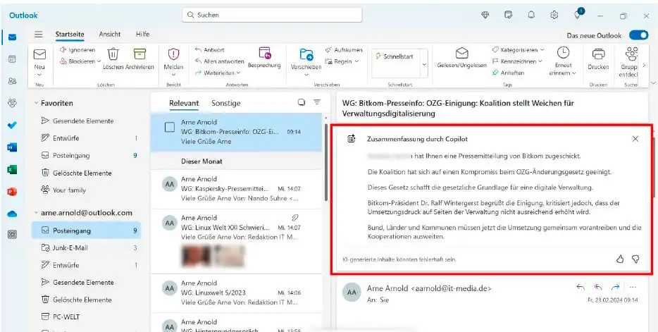 Diese Funktion ist tatsächlich eine der Stärken von Copilot Pro. Das Tool erstellt im Handumdrehen eine Zusammenfassung der Mail. Du solltest wichtige Mails dennoch selbst lesen, denn nicht immer ist die Zusammenfassung fehlerfrei. Diese Funktion ist zudem nur nutzbar, wenn es sich um ein Microsoft-Mailkonto handelt. Sehr nützlich ist wiederum, dass neu eingegangene Mails zusammengefasst werden und diese Zusammenfassung direkt über der Mail im Nachrichtenfenster sichtbar ist.