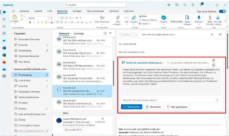 Copilot Pro funktioniert nur eingeschränkt für das Mail-Konto, mit dem das Tool abonniert wurde, auch wenn weitere Mailadressen im Account hinterlegt wurden. Wenn es sich um sehr kurze Mails handelt, ist die Zusammenfassung oft sogar umfangreicher als die ursprüngliche Mail. Teilweise ist die Zusammenfassung jedoch verständlicher und damit durchaus nützlich. Du kannst Copilot Pro auch anweisen, eigenständige Antworten auf Mails zu verfassen, solltest diese vor dem Absenden jedoch sichten, weil die Formulierungen oft etwas harsch sind und manchmal wichtige Inhalte fehlen.