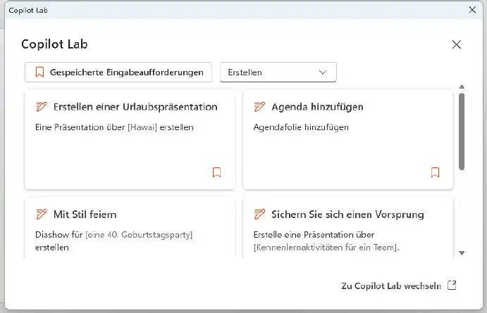 Dennoch ist Copilot Pro in einigen Fällen hilfreich. Klicke im Eingabefeld auf eines der Symbole und es erscheinen potenzielle Aufträge, die das Tool ausführen kann. Beispiele dafür sind die Erstellung von Diashows zu Geburtstagen oder die Anfertigung von Urlaubspräsentationen. Außerdem ist eine Website mit weiteren Optionen verlinkt. Wenn eines der Beispiele passt, bietet der Copilot Pro mit der entsprechenden Präsentation zumindest die Basis für die Erstellung individualisierter Folien. Ob die Vorlage passt, muss in jedem Einzelfall gründlich überprüft werden.