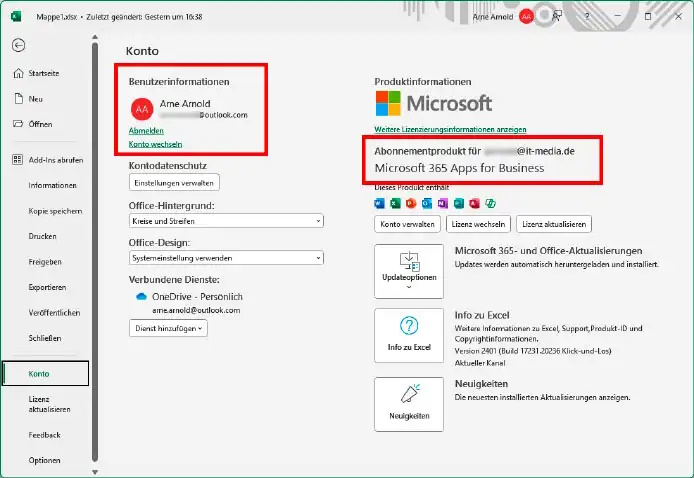 Das ist grundsätzlich unproblematisch, führt in der Praxis leider dennoch immer wieder dazu, dass Copilot Pro nicht zur Verfügung steht. Schau deshalb im Bereich Datei – Konto nach, ob bei den „Verbundenen Diensten“ dein berufliches OneDrive-Konto auftaucht. Du solltest außerdem vermeiden, Dokumente aus deiner Business One Cloud zu öffnen, denn auch das kollidiert mit Copilot Pro.