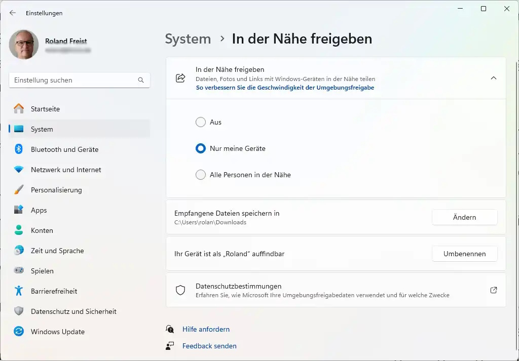 Auf allen Rechnern, unter denen Du Informationen austauschen möchtest, musst Du dazu zunächst die Umgebungsfreigabe aktivieren. Die Option findest Du in den Einstellungen unter „System“. In Windows 11 heißt der Punkt „In der Nähe freigeben“, bei Windows 10 lautet die Bezeichnung auf „Gemeinsame Nutzung“. Außerdem ist bei Windows 11 die Funktion direkt in der Taskleiste über das Netzwerksymbol erreichbar.