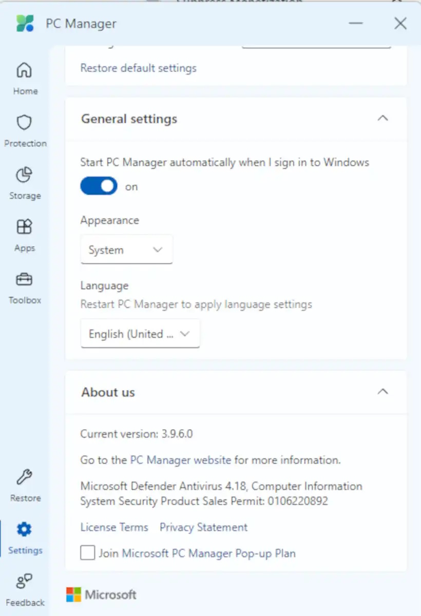 Das Fenster vom PC Manager (siehe Screenshot oben) erscheint auf dem von uns verwendeten Windows-11-Rechner unten rechts auf dem Bildschirm. Dort lassen sich alle gewünschten Einstellungen vornehmen. Unter anderem kannst Du dort festlegen, ob der PC Manager immer starten soll, wenn Windows startet. Die Oberfläche des PC Managers gibt es aktuell nur in Englisch und in einigen asiatischen Sprachen. Deutsch wird derzeit (noch) nicht unterstützt.