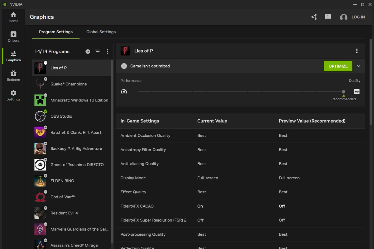 In der Nvidia App hast Du im Bereich „Graphics“ die Möglichkeit, Deine Bibliothek der installierten Spiele zu scannen. Diese erscheinen danach in einer Liste. Wähle hier die Anwendung aus, die Du optimieren möchtest. Dazu klickst Du oben rechts auf „Optimize“. Bei allen auf diese Weise optimierten Spielen erscheint ein praktischer Schieberegler. Darüber stellst Du die Art der Optimierung ein und bestimmst, ob Leistung oder Qualität für Dich wichtiger sind. Diese zwei Modi für Performance und Quality sind auch von vielen Konsolenspielen her bekannt.