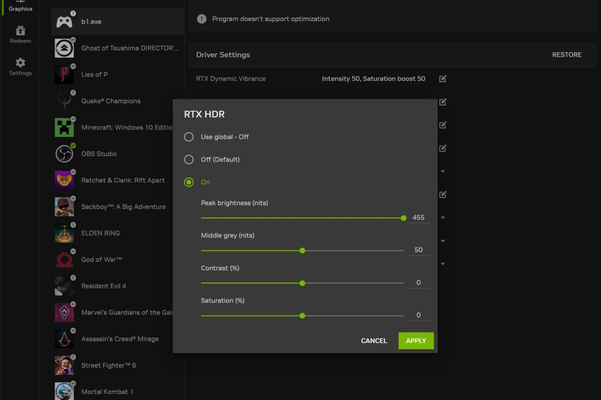 Ebenfalls anpassbar ist in den globalen Einstellungen das sogenannte RTX HDR. HDR steht für High Dynamic Range. Damit lassen sich realitätsnahe Helligkeitswerte in Spielen erreichen. Wenn Du HDR in Spielen nutzen möchtest, muss der Titel diese Funktion normalerweise von sich aus anbieten. Dank Nvidia App kannst Du HDR jedoch zu jedem Spiel hinzufügen, auch wenn es dieses von Haus aus nicht beherrscht.