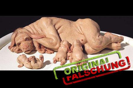Echtes Foto, falscher Text! Dieses Foto ist echt und kein Trick mit einem Bildbearbeitungsprogramm. Allerdings zeigt es keine Kreuzung aus Mensch und Hund oder Mensch und Schwein. Die aufgenommene Kreatur ist nämlich nicht lebendig sondern eine Skulptur. Das Stück „The Young Family“ stammt von der Künstlerin Patricia Piccinini und war im Jahr 2003 mit anderen skurril wirkenden Stücken wie „Leather Landscape“, einer Anordnung von Mischwesen halb Mensch halb Erdmännchen, auf der Ausstellung für moderne Kunst „Biennale di Venezia“ ausgestellt. Weitere Bilder sind auf der Homepage der Künstlerin zu bewundern.