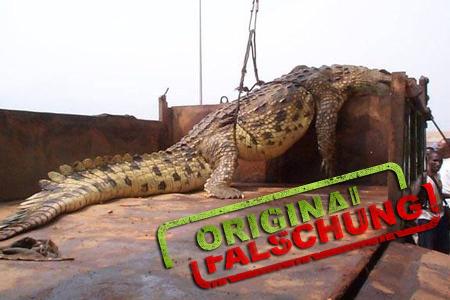 Echtes Foto, falscher Text! Angeblich soll hier ein Krokodil zu sehen sein, das nach dem Katastrophen-Hochwasser von New Orleans in der Stadt zurückgeblieben ist. Bei dem Tier handelt es sich allerdings um ein Nilkrokodil das nur in Afrika heimisch ist. Dieses riesige Krokodil, das 5 Meter lang war und 850 Kilo schwer, wurde 2003 in der Republik Kongo erlegt und zu einem Präparator transportiert.