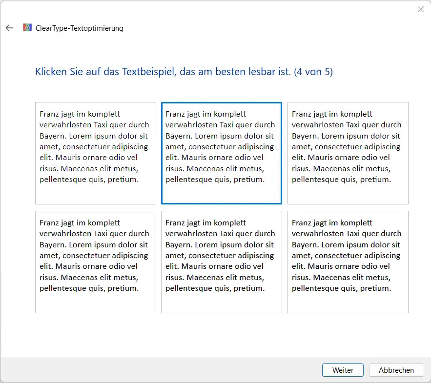 4. Danach erscheinen mehrere Textbeispiele. Wähle jeweils die Variante aus, die für Dich am besten lesbar ist.