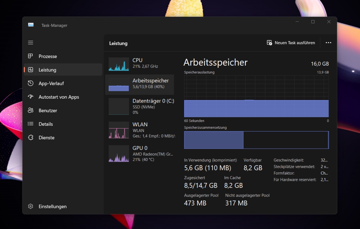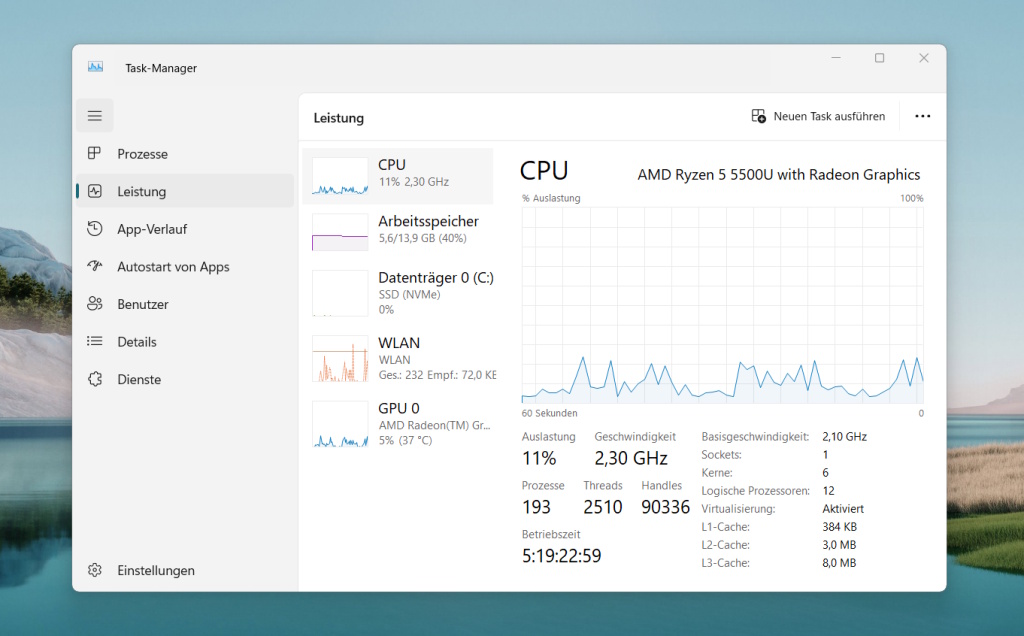 Auch die Performance einzelner Anwendungen kannst Du über den Task-Manager einsehen.