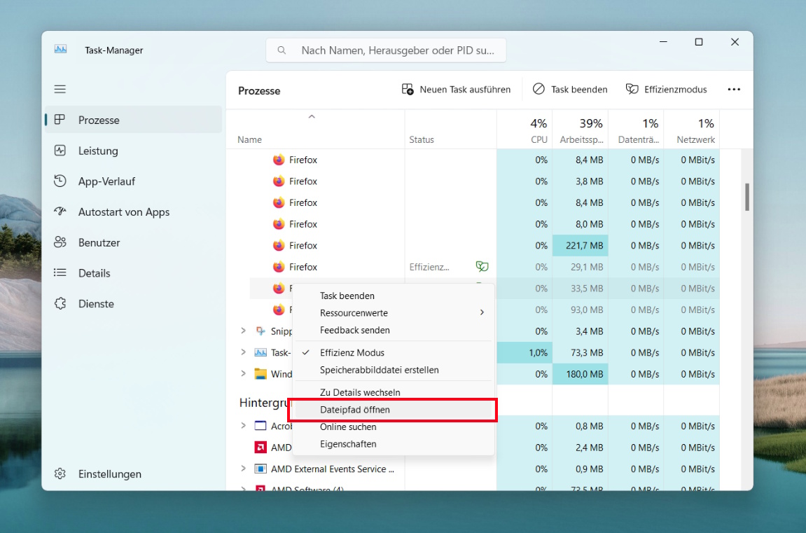 Dazu musst Du in die Registerkarte Prozesse wechseln. Du findest sie im Fenster auf der linken Seite im Task-Manager. Wenn Du mithilfe der rechten Maustaste eine App anklickst und dann den Menüpunkt Dateipfad öffnen auswählst, öffnet sich der „Fundort“ in einem neuen Datei-Explorer-Fenster.