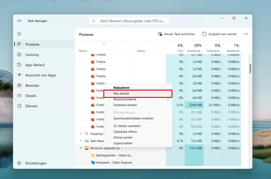 Zur Fehlerbehebung: Windows Explorer neu starten