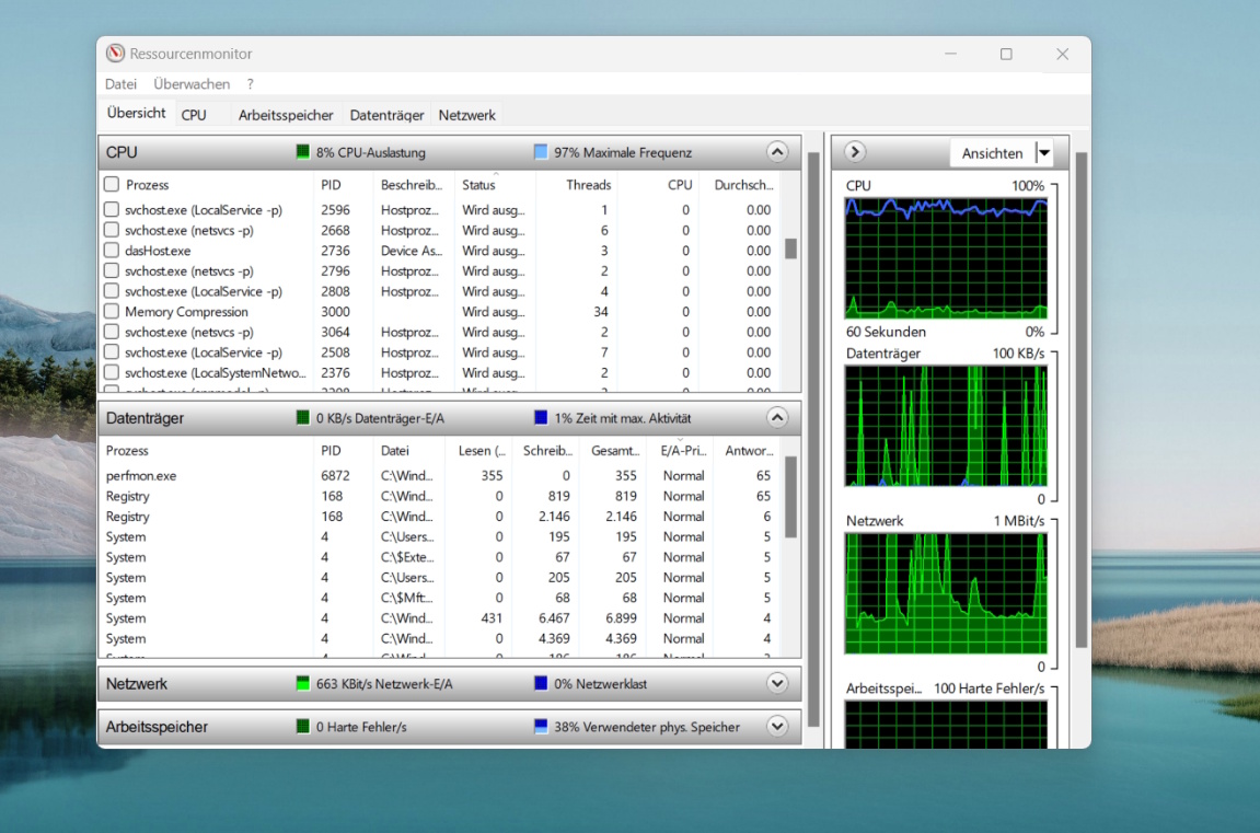 Detailliertere Informationen findest Du oben rechts über das Drei-Punkte-Menü unter Ressourcenmonitor. Unter der Registerkarte Netzwerk siehst Du alle Prozesse, die von Deinem Netzwerk genutzt werden, und auch deren Anteil an der verwendeten Bankbreite.
