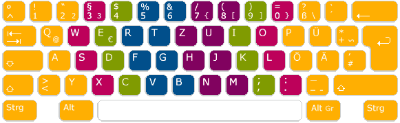 Welcher Finger für welche Tasten zuständig ist, können Sie jederzeit– also auch während des Trainierens – anhand der farblichen Zuordnung der Fingerbuttons "Klein – Ring – Mittel – Zeige" und der entsprechend farbigen Tasten der Tastatur erkennen.