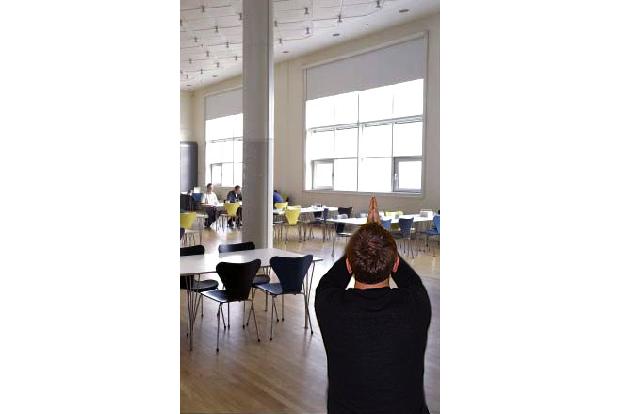 Dafür gibt es fünf Sterne:Während der Abwesenheit eines Kollegen dessen Stuhl in den Lift fahren.