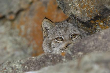 Dieser kanadische Luchs hat schon das nächste Ziel im Visier. Und weil er sich gern hinter Steinen und Baumstämmen herumtreibt, hat sein graues Fell exakt die richtige Tarnung für ihn.