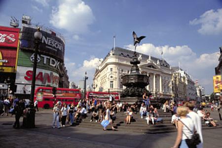 Touristen unterhalb der Eros Statue am Picadilly Circus