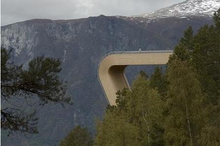 Stegastein Aurland Lookout, Norwegen: Der Stegastein ist eine 30 Meter lange Aussichtsrampe aus Holz. Die Rampe ermöglicht über den Baumwipfeln einen atemberaubenden Blick auf den Aurlandsfjord. Besonderen Nervenkitzel bietet die Glasscheibe, die die Plattform am Ende abschließt und die den Eindruck vermittelt, man stünde frei auf der Rampe.