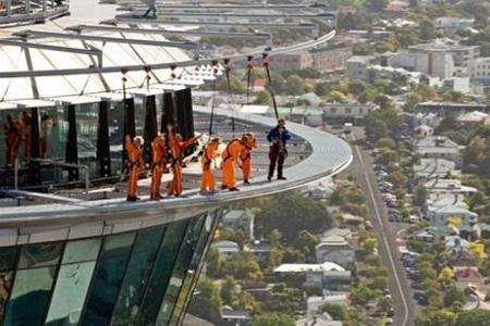 Auckland Sky Tower, Neuseeland: Der Sky Tower ist der höchste Fernsehturm der Südhalbkugel und besitzt gleich drei Aussichtsplattformen. Zwei sind geschlossen, die Dritte ist eine Freiluftplattform auf 220 Metern Höhe. Auf dem Skywalk können besonders Mutige angeseilt auf einem Gitter um den Turm laufen und sich mit dem gesamten Körper ins Nichts beugen.
