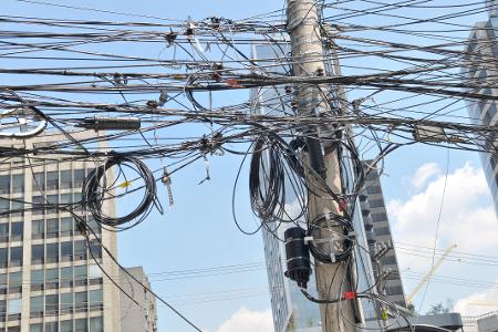 Chaos oben!Was Sie hier sehen ist keineswegs unnormal, sondern Alltag in Brasilien. Denn die öffentlichen Stromleitungen in Sao Paolo fallen unter die Kategorie "krasse Funkstörung". Hier herrscht eben heilloses Chaos an den Strommasten! Doch die brasilianischen Amtsträger und Stromkonzerne beunruhigt das offenbar nicht weiter. Solange es funktioniert, werden solche Chaosmasten hingenommen und die Brasilianer bleiben fröhlich und optimistisch. Bis zum nächsten Stromausfall...