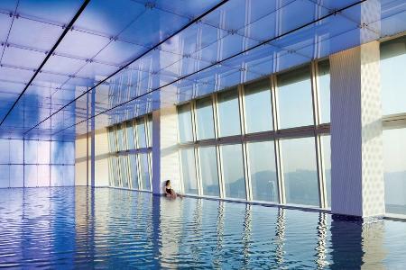 Das neue Hotel „Ritz Carlton“ in Hongkong belegt im Wolkenkratzer des „International Commerce Centre“ die obersten Etagen – in fast 500 Metern Höhe.