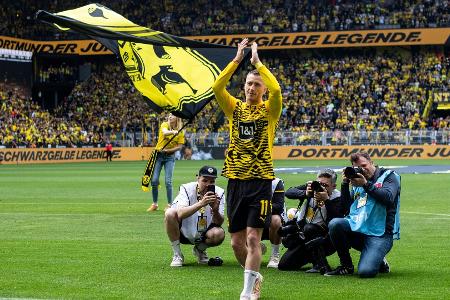 Marco Reus ist im Rahmen seines 294. und letzten Einsatzes für Borussia Dortmund in der Fußball-Bundesliga emotional verabschiedet worden. Vor dem Heimspiel am 34. Spieltag gegen Absteiger Darmstadt 98 überreichten ihm zunächst die Vereinsvertreter um Geschäftsführer Hans-Joachim Watzke einen großen Blumenstrauß und ein Porträt, dann ließ sich Reus von den Fans im Stadion feiern. Kurz vor dem Anpfiff präsentierte zudem noch die Südtribüne eine große Choreo mit der Nummer elf und einem "Danke, Marco!"-Spruchband.
